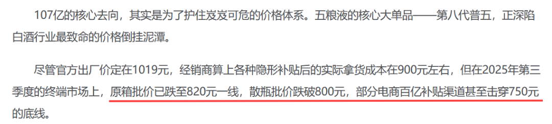 电商平台“百亿补贴”常态化,冲击价钱体系,线上廉价冲击线下渠谈,变成“越卖越亏、越亏越卖”的怪圈,五粮液等高端品牌首当其冲。