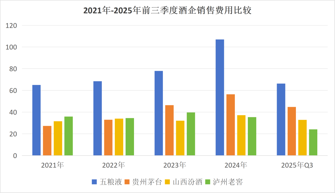 多年以来,五粮液销售用度相对较高。直至2025年前三季度,五粮液销售用度仍为66亿元,远超贵州茅台、山西汾酒等同行酒企。