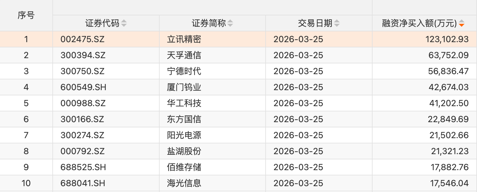 个股方面开yun体育网,32只个股获融资净买入额超1亿元。立讯精密获融资净买入额居首,净买入12.31亿元;融资净买入额居前的还有天孚通讯、宁德期间、厦门钨业、华工科技、东方国信、阳光电源、盐湖股份、佰维存储、海光信息。