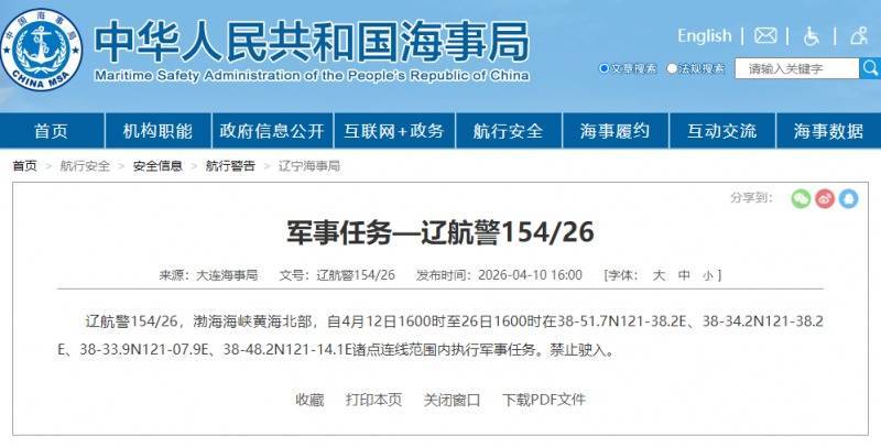 据中国海事局网站音尘,大连海事局发布漂荡警告开云体育,4月12日16时至26日16时,渤海海峡黄海北部引申军事任务,不容驶入。