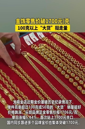 价钱跳涨,头部品牌足金零卖价报1706元/克,单日涨幅5.44%,初度站上1700元关隘,国内同步跟进多个品牌金价也集体梗阻1700元。